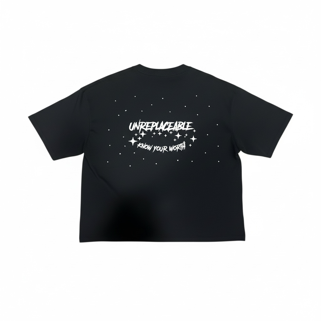 A statement in simplicity. The Standard Tee features a clean dropped-shoulder silhouette with a subtle “Unreplaceable” chest placement for a refined front profile. On the back, bold messaging takes center stage — “Know Your Worth” surrounded by star and rhinestone detailing. Crafted for everyday confidence, this tee is designed for those who stand firm in their value and express it without apology