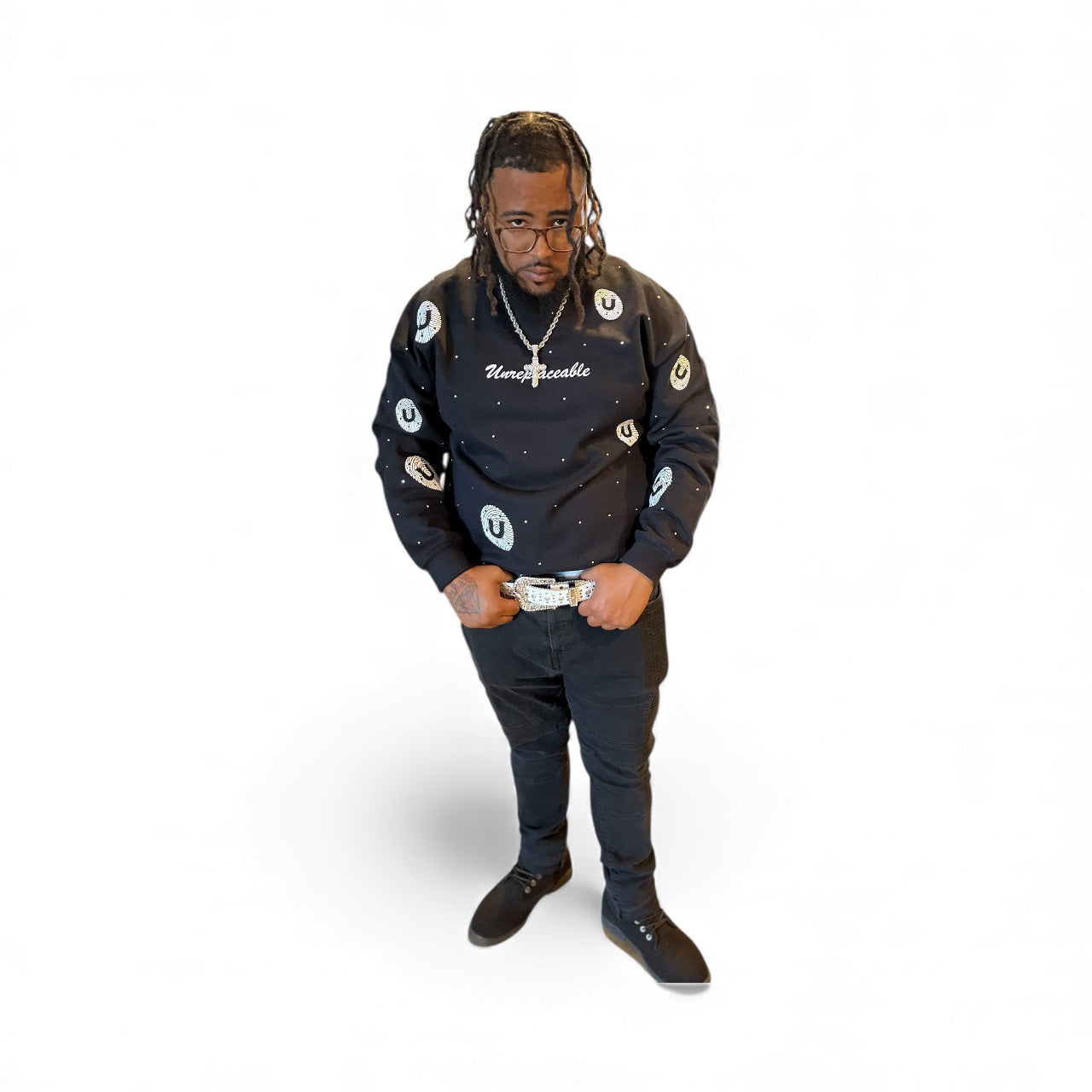 Step into elevated streetwear with this long sleeve wrapped in your signature logo, printed in bold white suede and drenched in hand-placed rhinestones across the front. Clean, icy, and built to stand out without trying.
